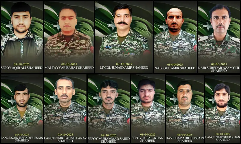 شہادت پانے والے 9 بہادر سپاہیوں میں ضلع خیبر کے رہائشی 38 سالہ نائیک صوبیدار اعظم گل، ضلع کرم کے رہائشی 35 سالہ نائیک عادل حسین، ضلع ٹانک کے رہائشی 34 سالہ نائیک گل عامر، ضلع مردان کے رہائشی 31 سالہ لانس نائیک شیر خان، ضلع مانسہرہ کے رہائشی 32 سالہ لانس نائک تالش فراز، ضلع کرم کے رہائشی 32 سالہ لانس نائک ارشد حسین، ضلع مالاکنڈ کے رہائشی 28 سالہ سپاہی طفیل خان، ضلع صوابی کے رہائشی 23 سالہ سپاہی عاقِب علی اور ضلع ٹانک کے رہائشی 24 سالہ سپاہی محمد زاہد شامل ہیں۔